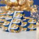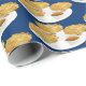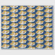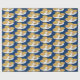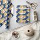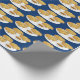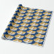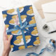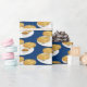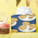 Slå in papper som visar ett upprepande mönster av att le latketecknader på en plätera med gräddfil- och äppleall sås på en blåttbakgrund.