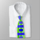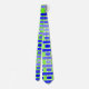 This tie has a geometric design of lines in shades of blue and green woven to make a plaid.