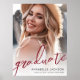 Denna enkla och minimalistiska examensfestskylt har ett helsidesfoto av examenstagaren med ”Examenstagare” visat i fet röd handskriven stil överst i nederkant. Nedanför syns examenstagaren namn, ”Klass av 2026” och skolans namn i rena svarta teckensnitt över en mjuk vit gradient som tonar ut sig sömlöst i bilden, vilket säkerställer att allt är tydligt och lätt att läsa.