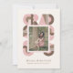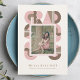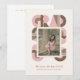 Retro-style, yet modern, graduation announcement photo card that features the word "GRAD" designed with geometric shapes in various colors that form a border around the photo of the graduate. Retro colors—green, dusty pink, mint—add to the card's retro style.