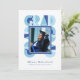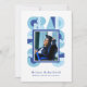 Retro-style, yet modern, graduation announcement and party celebration photo card that features the word "GRAD" designed with geometric shapes in various colors that form a border around the photo of the graduate. Retro colors—blue, teal, white—add to the card's retro style.