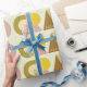 Retro-style graduation gift wrapping paper that features the word "GRAD" designed with geometric shapes in various colors. Retro colors—yellow, pink, brown, and green—add to the retro style.