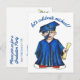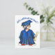 Anpassa med din evenemangsinformation! Inbjudningsdesign i vykortstil med en originell illustration av en pojke i blå studentmössa och studentklänning som håller ett diplom.