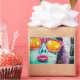 En coola som målar på en tegelvägg av en flicka i shock rosa och gult solglasar med shock rosa läppstift. Hon är klar med ljusturkos och mynta grönt.