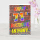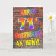 Framsidan av detta pulserande, roligt och spännande, födelsemetterade hälsningskort visar LYCKLIG 71ST BIRTHDAY med brev som har en flerfärgad regnbåge som övertoning mönster, och en gult i färgaden personlig, på en namn bakgrund av en tegelvägg. Utseendet är inspirerat av graffiti eller gatukonst som ritats på väggen. Insidan innehåller ett hälsning-födelsedagsmeddelande som kan anpassas. En roligt, lycklig, ett anpassat födelsedagskalenderkort som detta kan vara ett speciellt sätt att hedra minnet av någons 71-årsdag. [~Z0000357]