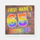 Framsidan av denna pulserande, roligt- och öga-populerande pappra napkin-design har ett eget namn och meddelandet "65E BIRTHDAY!" med brev med ett flerfärgat regnbågsspektrum inspirerat övertonaren mönster, på en tegelvägg inspirerad av mönster. Stil inspireras av gatukonsten eller graffiti som ritats på en mur. Roligt pappra blöjor av det här slaget kan användas vid en födelsedagsfest som hålls för att hedra någon som firar sin sextiofemårsdag. [~Z0000367]