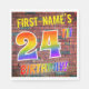 Framsidan av den här roligten har öga-infångande och spännande papper napkin-design med födelsedagstext ett eget namn, och meddelandet "24:e BIRTHDAY!" med brev med ett flerfärgat regnbågsspektrum inspirerat övertonaren mönster, på en tegelvägg inspirerad av mönster. Utseendet inspireras av gatukonsten eller graffiti som ritats på en vägg. Roligt pappra blöjor av detta slag kan användas vid en födelsedagsfest som hålls för att hedra någons tjugofjärde födelsedag. [~Z0000367]