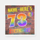 Framsidan av denna sjudande, spännande och öga-infångande pappra napkindesign har en personlig namn, och meddelandet 73RD BIRTHDAY! med brev med ett flerfärgat regnbågsspektrum inspirerat övertonaren mönster, på en tegelvägg inspirerad av mönster. Gatukonsten eller graffiti som ritas på en vägg är inspirerande. Roligt pappra blöjor av detta slag kan användas vid en födelsedagsfest som hålls för att hedra någons 73-årsdag. [~Z0000367]