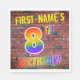 Framsidan av denna pulserande, roligt och spännande pappra napkindesign med födelsedagstext har ett anpassade namn, och meddelandet "8TH BIRTHDAY!" med brev med ett multifärgat regnbågsspektrum inspirerade gradient mönster, på en tegelvägg, inspirerad av mönster. Utseendet inspireras av gatukonsten eller graffiti som ritats på en vägg. Roligt pappra blöjor av det här slaget kan användas vid en födelsedagsfest som hålls för att hedra någons åttonde födelsedag. [~Z0000367]