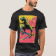 A green T-Rex shreds across a splattered yellow-pink backdrop, rendered with stencil-like strokes. Urban energy and bold contrast make this a standout street-art design.