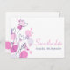Ett vackert och enkelt rosa lila plum och en marin blå blomma och grafiska blad sparar vykortet bröllop. En del av den moderna blomdukens bröllop-uppsättning. Sarah Trett har utformat en exklusiv för elegant.