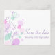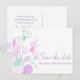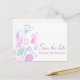 Ett vackert och enkelt rosa-lila och en grönt-blomma och grafikblad sparar bröllop-vykortet. En del av den moderna blomdukens bröllop-uppsättning. Sarah Trett har utformat en exklusiv för elegant.