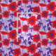 Fetma lila löv och röda vallmotyger som är mönstrade. Designad av Sarah Trett.