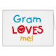 Gram Kärlek Me T-tröjor, kort, klistermärken, kokodräkter och annat med färgstarkt rött, gult och blå text och hjärtdesign. De här Gram Kärlek-kläderna och presentplaggen kommer att få ett leende på gram!