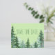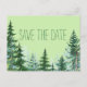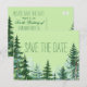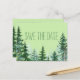 Granbröllop save the date vykort med rustika träd på en blekgrön bakgrund. Du kan lägga till din egen text i den typsnittsstil du föredrar. Du kan också ändra typsnitt och bakgrundsfärg.
