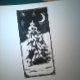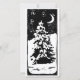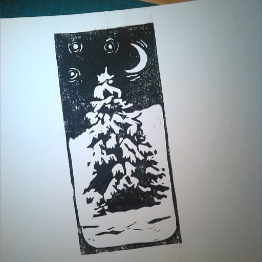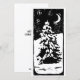 Svart-vit linoleumsnitt av en fridfull vinterscen: en ensam gran som står i ett snöigt landskap på natten, med en stjärnhimmel ovanför. "God Jul" skrivet på baksidan.