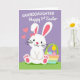 This card shows a white bunny with pink inner ears and paw pads, wearing a small pink bow on one ear, and its rosy cheeks and gentle smile suggest a sweet bond 🐰. The bunny sits low and centered on a bright green strip of ground, as if posing for a treasured springtime moment. To the bunny’s right is a basket with soft pastel stripes, filled with egg shapes in light spring colors that hint at a first seasonal celebration. Above the illustration, the word “GRANDDAUGHTER” appears in uppercase lettering, with “Happy 1st Easter” placed nearby in a lighter, flowing style. The lettering is set high on the lavender background, standing out clearly without crowding the scene. Small hearts float near the bunny’s head, adding a tender, affectionate note like a quiet message between loved ones 🌷. The background stays a calm lavender while the green ground forms a neat base line under the bunny and the basket.