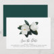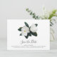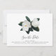 Den moderna blommigten sparar datumkortet med en enkel och minimalistisk textlayout som fylls av ett par snygga vita magnoliska blommor och spola mörk grönt löv.