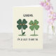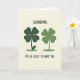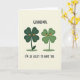 This card shows two smiling four-leaf clovers standing close together on a creamy off-white background, leaning in like old friends sharing a quiet joke 💚. The left clover is a deeper forest green with a curled, spiraling leaf along its stem, while the right clover is a lighter spring green that brightens the pair ☘️. Their faces are simple and sweet—tiny black dot eyes, curved smiles, and rosy-orange blush spots that make their closeness feel affectionate and safe. Soft, diffused lighting gently rounds their shapes and adds a mild glow around the edges, keeping the scene calm and cozy. Above the clovers, “GRANDMA.” sits in uppercase sans-serif lettering, centered and easy to read in dark green. Below them, “I’M SO LUCKY TO HAVE YOU.” appears in matching uppercase type, also centered, balancing the layout without crowding the artwork. The two greens—emerald and chartreuse—work together so the pair feels connected, like they belong side by side. Slightly textured edges and smooth shading give the clovers a plush, rounded look against the open background.