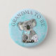 En söt koala bär "GRANDMA to be" babyduschknapp, blå bakgrund med rand.