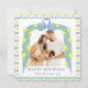Detta vackra julkort har en akvarellgrön ram för ett foto. Ramen är gjord av blå akvarellband med chinoiserie juldekorationer och grönt runt ramen med julbukett. Baksidan av kortet har grönt med julgranar och krans.