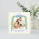 Detta vackra julkort har en akvarellgrön ram för ett foto. Ramen är gjord av akvarellblått band med chinoiserie juldekorationer och grönt runt rammen med julbukett. Baksidan av kortet har grönt med julgranar och krans.