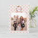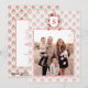 This vertical Christmas photo card has a preppy grandmillennial design featuring a floral crest surrounded with berries an with a monogram letter in the center. The front and back have a coordinating damask pattern.
