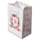 This Christmas gift bag has a preppy grandmillennial design featuring a floral crest surrounded with berries with a monogram letter in the center. There is a coordinating damask pattern on the sides.