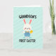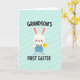 Designed with a sweet, simple illustration, this Easter card centers on a white, long-eared bunny standing front and center with a gentle, friendly look 🐰. The bunny wears soft blue overalls with a tiny pocket and a small yellow bow tie, adding a dressed-up touch that feels like it’s ready for a special day. Rosy pink cheeks and warm, easy eyes give the face a tender, affectionate expression, like it’s sharing a quiet moment with someone close. In one paw, it holds a shiny golden oval egg, angled slightly upward as if offering it as a small gift. The background is pale aqua with faint diagonal brush-like strokes that add texture without distracting from the character. Across the top, “GRANDSON’S” appears in uppercase lettering, and “FIRST EASTER” sits at the bottom in matching uppercase type, both in a dark tone that stands out clearly. A soft pastel palette of blues, pinks, white, and yellow keeps the scene light and springlike 🌷, with the bunny’s golden egg catching the eye against the cool aqua backdrop. The pale aqua background shows subtle diagonal strokes behind the centered bunny, with the top and bottom text framing the figure.