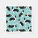 Den svarta och vita gräns-kollisionen sitter, stannar och rullar över på en blå bakgrund med tassavtryck, en roligt hund som kallas mönster.