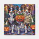 Beklagliga Gräns Collies klädda i lekfulla Halloween-kostymer bär pumpkiner medan man lurar eller behandlar under det månbelysta himmel. Denna festliga utformning belyser rasens intelligenta ögon, fluffy jackar och energiska personlighet, som på ett perfekt sätt fångar upp den förevändning och roligt stämningen i Halloween-natten. Ett härligt firande för hundälskare och Halloween fläkt.