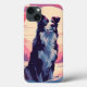 Färgkonst med en Gräns-kollie i snöskogen under solnedgången