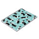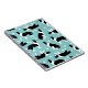 Den svarta och vita gräns-kollisionen sitter, stannar och rullar över på en blå bakgrund med tassavtryck, en roligt hund som kallas mönster.