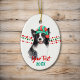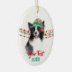 Ett vackert svart och vitt hund i Gräns Collie bär en röd och grönt Jultomten hatt framför röda och grönt julklapp på båda sidor om detta prydnadsämne. Vid grund finns två texter där fält matchar rött och grönt för din egen text. Baksidan har samma bild med en tredje fält i rött. Perfekt för alla som ägs av en Gräns-kollie!