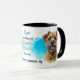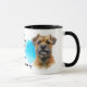 En vattenfärg porträtt i en Gräns Terrier-Hund är utmärkande på två sidor av mugg. Varje bild placeras på en ljusblå stäng bakgrund. Mellan två bilder finns texten som beskriver denna lojala och lekande följeslagare, med "GRÄNS TERRIER hund" svart i grund. All text är lätt att anpassa till vad du vill, så att du kan anpassa den eller beskriva din egen lojala vän!