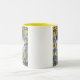 Cuteness finnas i överflöd med denna tvåsidiga design av en gränsCollievalp som omges av lilor och gula blommor på en vitmugg med en gul insida.