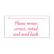 Den här klassiska gummikonstruktionen frimärke innehåller meddelandet "Granska, korrigera, initiera och skicka tillbaka." och en rad där ett namnteckning eller initialer ska skrivas ovan. Den skulle kunna användas av en lärare eller en administrativ professionell för att begära att någon granskar och bekräftar innehållen av ett dokument eller något annat pappersarbete.