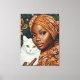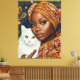 En ung afrikansk kvinnas fånge porträtt i ett pulserande mönstrat huvudslag, som varsamt håller en vit katt mot en lush botanisk bakgrund.