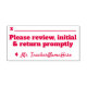 Denna grundläggande konstruktion av gummi frimärke innehåller meddelandet "Granska, starta om och returnera snabbt", tillsammans med en rad som namnteckning eller initialer kan skrivas ovan. Den har också en personlig- eller lärarlärares namn. Det skulle kanske kunna användas av en lärare, lärare eller lärare för att begära att en eller flera av föräldrarna i student granskar student arbete med ett test, en papper eller någon annan uppgift.
