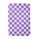 A purple and white checkerboard pattern with alternating squares, creating a balanced design. The vibrant colors give a playful, energetic feel.