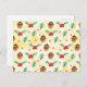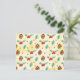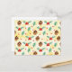 Ett vykort med ett sött mönster med gräs-koner och holly på en gult vattenfärgsbakgrund med små vita cirklar spridda runt.