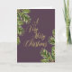 Julkortet erbjuder ett trendig och en modern design med en slående plommonbakgrund i mörken med en populär, handskriven kalligrafitext som lyder: A Väldigt God jul. Utformningen accentueras med vattenfärgsfärgat grenar i gräs nål.