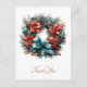 Tack vykort med söt julkrans. En fin bild med en gräs-andedräkt som dekoreras med röda blommor, holly och en underbar blå båge. Underbart.