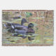 En para av gräsandet duckar simning i ett damm med nedgånglövverkreflexioner