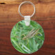 Denna briljanta nyckelkedja innehåller ett detaljerat makrofoto av en liten grönt gräshoppa med bruna fläckar sitta på gräset. I fotografiet ser du detaljerna i det skarvade ben, långa antenner och svart och guld öga i gräshoppan.