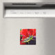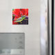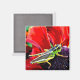 Den här strålande magneten i färgaden har en glansig grönt, gult och svart gräshoppor som går ut på lilan av en blomma med vackra röda blad.