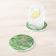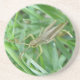 Denna söt sandsten underlägg ett detaljerat makrofoto av en liten grönt gräsklippare med bruna fläckar sitta på gräset. I fotografiet ser du detaljerna i det skarvade ben, långa antenner och svart och guld öga i gräshoppan.