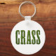 Nyckelkedja med ord GRASS. Texten är gjord av ett foto av gräs för att få det att se ut som om det skärs av sod. Fin design för gräsmatta- och bogseringsföretag.