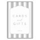 This wedding tabletop sign features a minimalist and elegant design with vertical gray stripes in varying shades, creating a sophisticated backdrop. The central white frame highlights the text "CARDS and GIFTS" in clean, uppercase sans-serif font, complemented by a stylish cursive "and." Below, "thank you" is written in smaller, lighter letters, conveying gratitude. The neutral color palette enhances its timeless appeal, making it perfect for expressing appreciation at your event.
