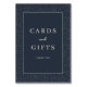 This elegant wedding tabletop sign features a sophisticated navy blue background adorned with a subtle white dot border, creating a refined and polished look. The central text is arranged in a clean, vertical layout with "CARDS and GIFTS" prominently displayed in uppercase serif font, complemented by a whimsical script for the word "and." Below, "THANK YOU" adds a heartfelt touch in a slightly smaller, straightforward typeface. The design exudes gratitude and warmth, making it perfect for expressing appreciation at your special event.